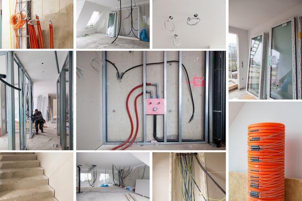 Auch im Innenbereich geht es zügig voran: Die Kellerdecken sind vollständig gedämmt, ein Großteil der Fenster ist bereits montiert, und sowohl die Fassadenarbeiten als auch der Trockenbau haben begonnen. Teils wurde die Schüttung für den Estrich bereits eingebracht, und wo sie noch fehlt, folgt sie in Kürze. Parallel dazu läuft der erste Spachtelgang der Maler in sämtlichen Bauteilen. Selbst die ersten Eigengärten nehmen bereits Gestalt an: Substrat, Humus und die darunterliegenden Speicherplatten sind in Arbeit.