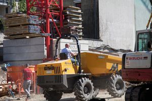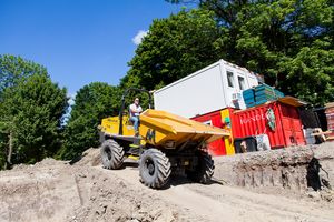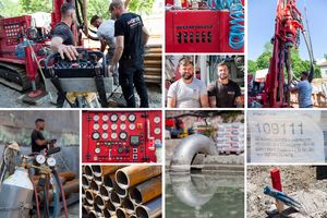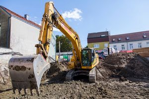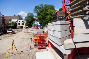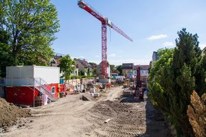 Auch die Baustelle selbst präsentiert sich fröhlich bunt: Inmitten von sattem Frühlingsgrün und unter strahlend blauem Himmel leuchten knallgelbe Baumaschinen, grüne Stromkästen sowie Kran & Geothermie-Bohrgerät in kräftigem Rot.