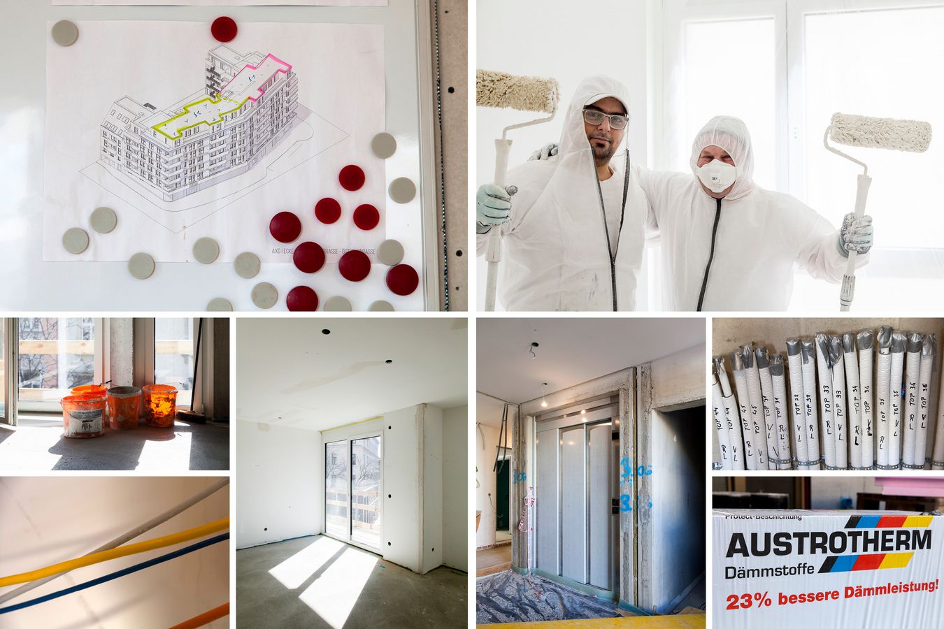 - Innenausbau: Wie schon beim Rohbau erfolgt auch der Ausbau von unten nach oben. Während sich der Trockenbau im 5./6. OG in der Fertigstellung befindet und bis Ende April inklusive Estrichs abgeschlossen sein wird, sind im 1.OG die Malerarbeiten bereits nahezu fertig. Anschließend folgen Fliesenleger und danach die Parkettarbeiten – wiederum etagenweise.
